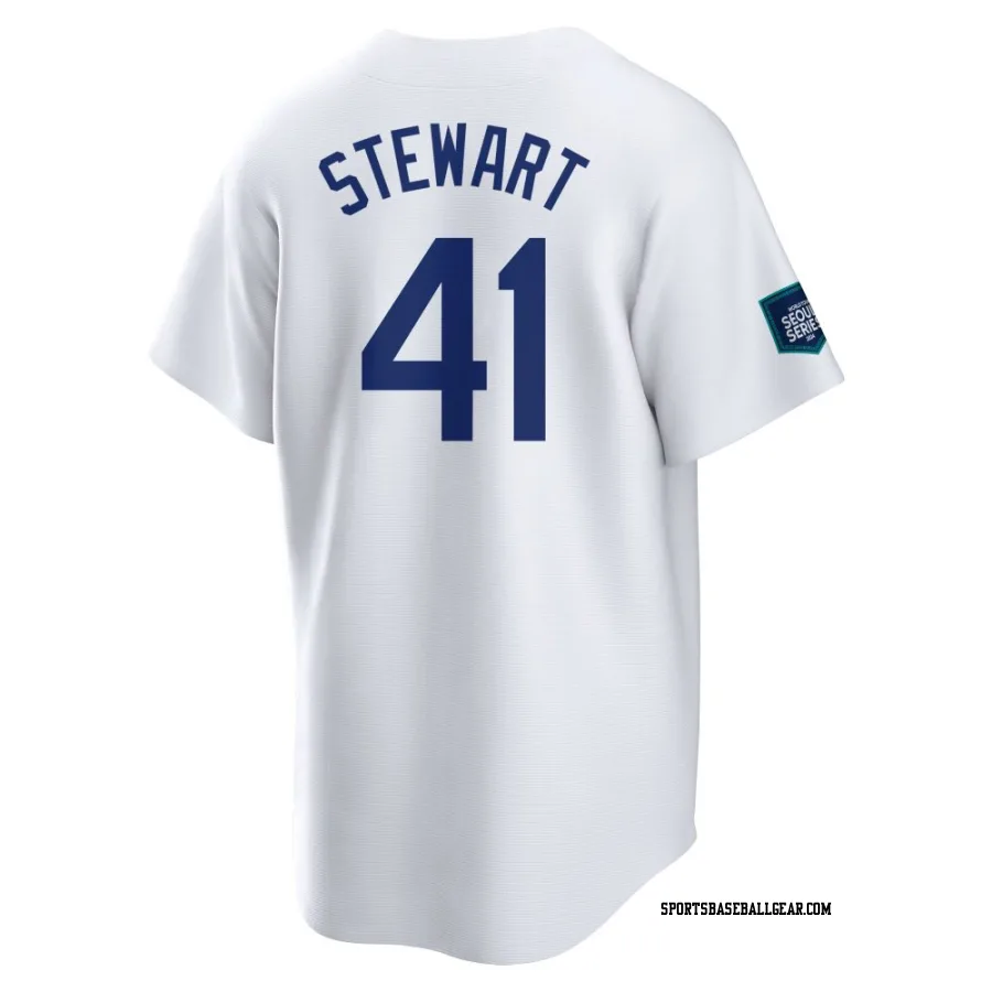 Get the Brock Stewart Youth Los Angeles Dodgers White Replica 2024 World Tour Seoul Series Home Jersey, showcasing the latest design and premium quality for dedicated fans. Elevate your baseball wardrobe now!