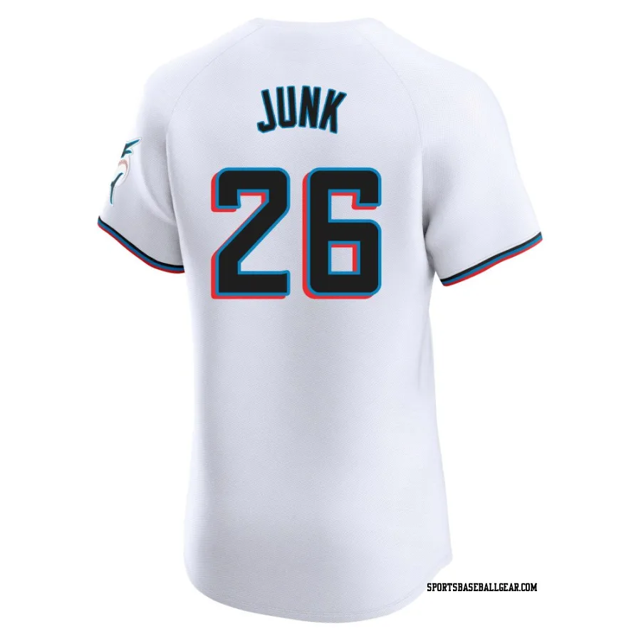 Get the Janson Junk Men's Miami Marlins White Elite Home Jersey, showcasing the latest design and premium quality for dedicated fans. Elevate your baseball wardrobe now!