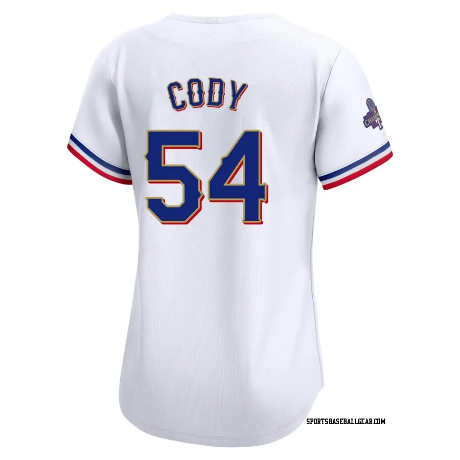 Get the Kyle Cody Women's Texas Rangers Gold Limited White 2024 Collection Jersey, showcasing the latest design and premium quality for dedicated fans. Elevate your baseball wardrobe now!