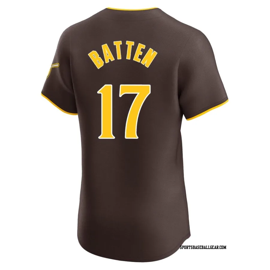 Get the Matthew Batten Men's San Diego Padres Brown Elite Road Vapor Premier Jersey, showcasing the latest design and premium quality for dedicated fans. Elevate your baseball wardrobe now!