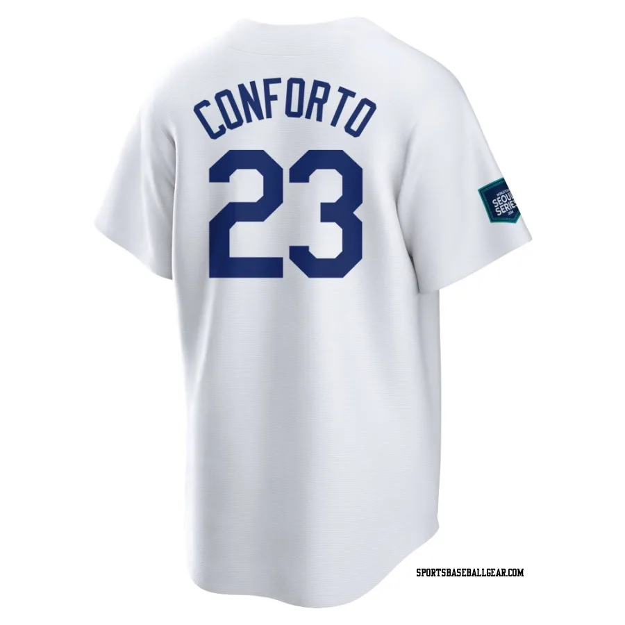 Get the Michael Conforto Youth Los Angeles Dodgers White Replica 2024 World Tour Seoul Series Home Jersey, showcasing the latest design and premium quality for dedicated fans. Elevate your baseball wardrobe now!