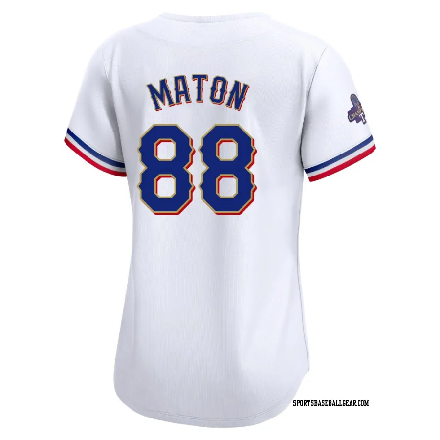 Get the Phil Maton Women's Texas Rangers Gold Limited White 2024 Collection Jersey, showcasing the latest design and premium quality for dedicated fans. Elevate your baseball wardrobe now!