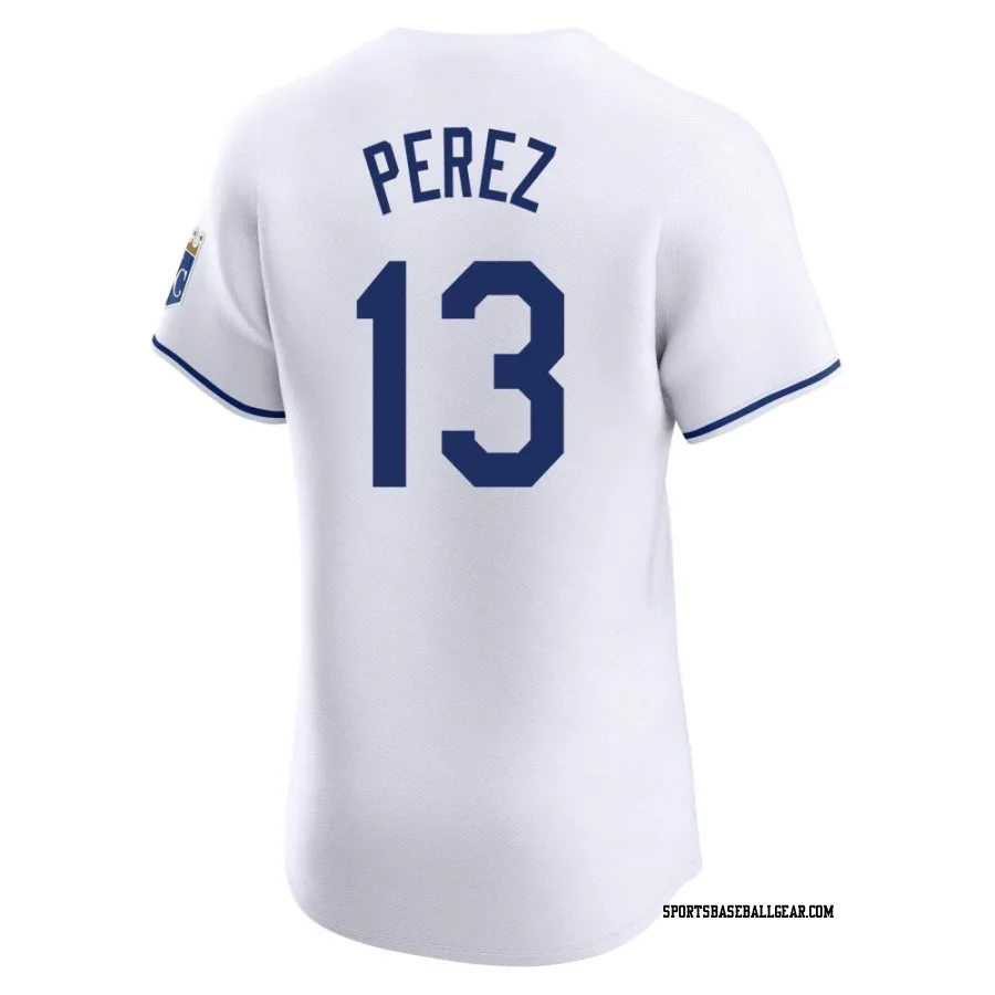 Get the Salvador Perez Men's Kansas City Royals White Elite Home Jersey, showcasing the latest design and premium quality for dedicated fans. Elevate your baseball wardrobe now!